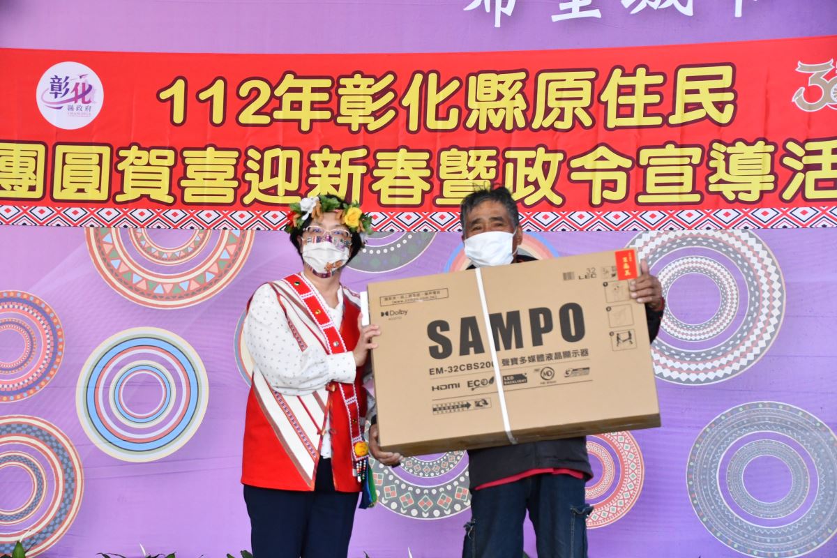 摸彩時間掀起活動最高潮,最吸睛的莫過於最大獎由王縣長提供的旗艦多媒體液晶螢幕、微電腦豪華微波爐及議長提供的50吋液晶電視。陳榮妹議員邀請各界人士熱心贊助的豐富摸彩品,每一樣都是原住民鄉親期望帶回家的好運禮。