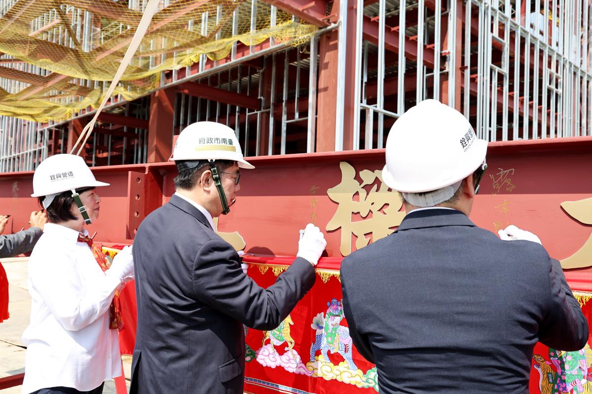 圖/荏原精密台南二廠上樑典禮,市長黃偉哲(中)及南科管理局副局長林秀貞(左)、台灣荏原董事長露木聖一(右),於樑上簽名。