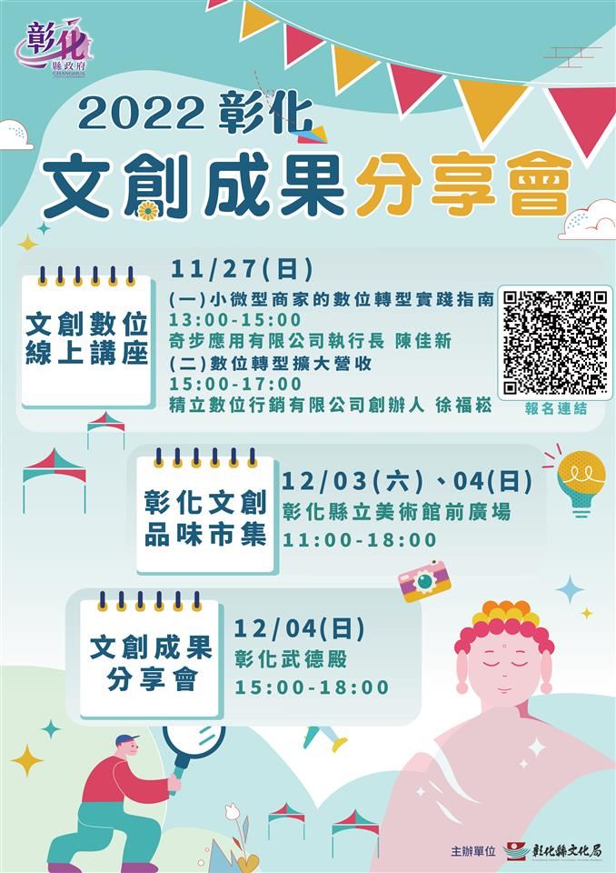 今(111)年度11月27日至12月4日特別辦理彰化文創成果分享會系列活動,結合文創數位線上講座、文創品味市集以及成果分享會,歡迎大家前來共襄盛舉!