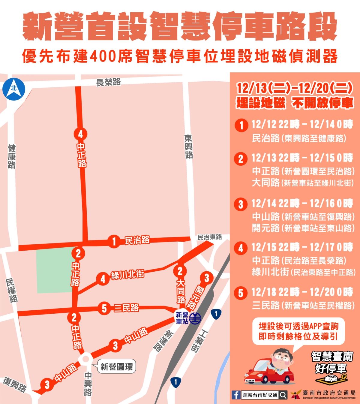 局長王銘德表示,目前就新營區重點停車熱區盤點,評估於南瀛綠都心及火車站周邊商業繁忙路段,優先設置地磁偵測器及導入智慧化停車服務,共規劃民治路、三民路、中山路、中正路、開元路、大同路、綠川路、綠川北街等8路段設置地磁(約400席)。