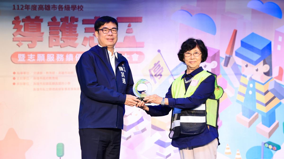 高雄市112學年度各級學校導護志工暨推展志願服務績優單位表揚大會,今(4)於樹德家商隆重舉行,市長陳其邁受邀出席頒獎,他致詞時表示,導護志工們每天風雨無阻守護學生就學安全,他代表家長及市民表達謝意,並頒發獎座,感謝這群為校園安全奉獻的英雄們,辛苦守護學童安全,並與獲獎志工代表共同宣導「路口慢看停、行人優先行」道安觀念。陳其邁肯定各級學校導護志工的貢獻,高雄市導護志工人數達5,100人,他強調市府會持續替志工辦理意外保險及醫療保險,提供完善照顧來保障志工執勤安全,此外也強化志工的教育訓練,全面提升值勤的專業知能,讓導護志工們在擔任工作時沒有後顧之憂,與學校一同維護學子的安全。陳其邁表示,為建構完善的通學環境,市府團隊與議會共同給予支持,編列2.5億預算,預計在兩年內將完成141所校園周邊通學步道,同時也會加強交通安全宣導,維護師生通行安全。最後他提到,特別感謝這些高齡的志工長輩們還守護在第一線當導護志工,很令人感動,同時也提醒志工們執勤時一定要注意自身安全。教育局表示,教育局每年定期分區輪評所屬志願服務運用單位,透過專業支持、資源整合、推展表揚、積極培訓、責任增強等策略,提供志工最完善的支持與學習服務。112年度共26個志願服務單位榮獲特優之肯定,其中莒光國小鼓勵高齡志工投入志願服務,安排彈性工時及體能負荷較輕微之服務工作,讓高齡志工從服務的過程中建立自信心、提升成就感,另有學校申請國際學伴CL計畫,與國際志工學生交流學習,除學生能接軌國際增進英語溝通能力,也拓展志工視野。福山國中在疫情下運用志工協助許多防疫工作,包含新冠疫苗接種、新生報到的防疫,及例行性新生健檢與流感疫苗接種等公衛相關活動。