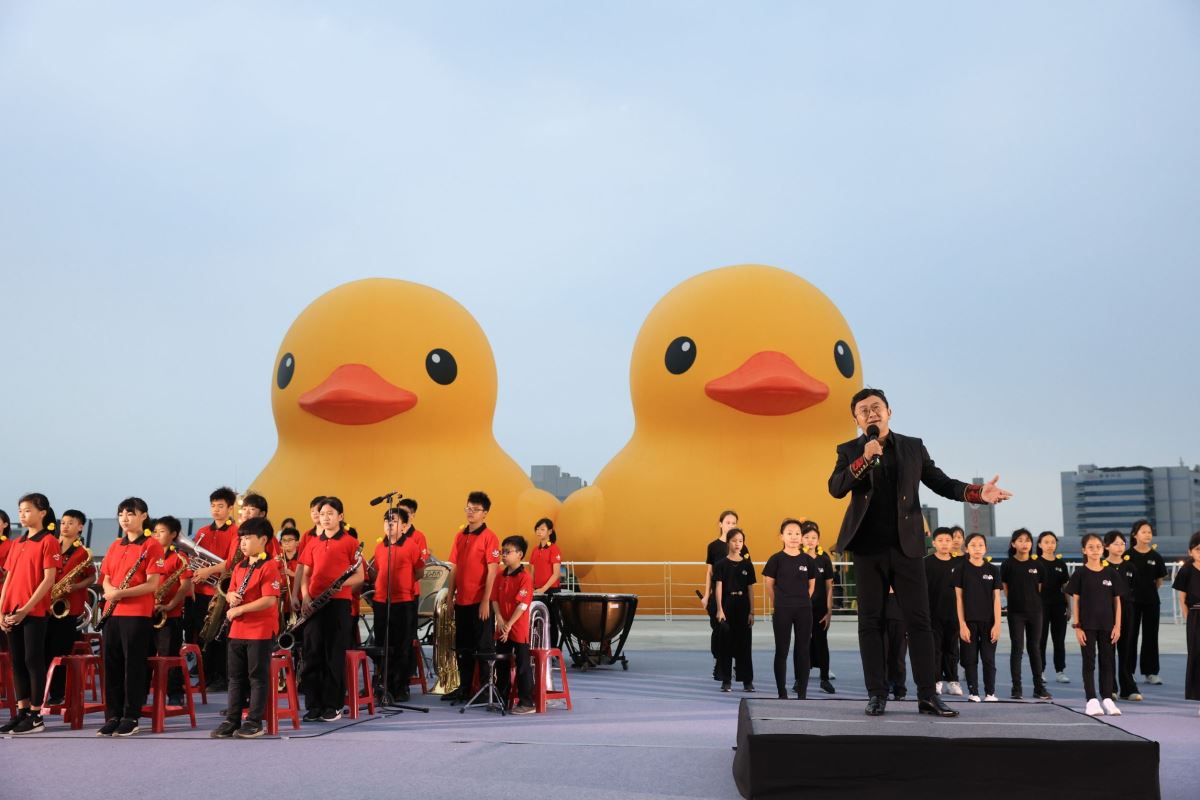 迎接「2024冬日遊樂園」展期最後一天,為感謝兩隻黃色小鴨為高雄帶來的幸福與歡樂,高雄市長陳其邁(25)日下午率領市府團隊出席黃色小鴨歡送趴,活動現場邀請新古典室內樂團、中正國小管樂班及福山國小合唱團等團隊,為兩隻小鴨送上了多元溫暖的樂音,伴隨著雙鴨合體離港。