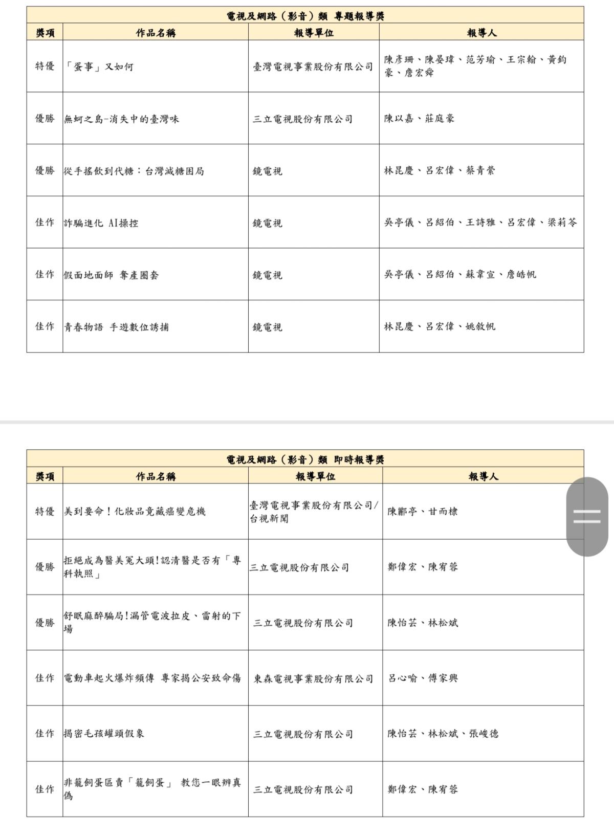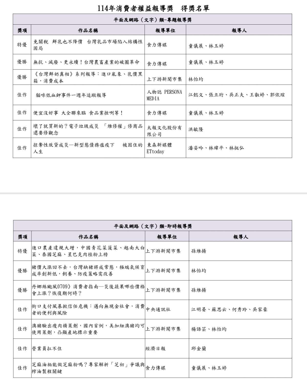 最受矚目的114年消費者權益報導獎的評審團特別獎與各獎項特優獎等得主,在頒獎典禮中當場揭曉,獲獎名單如下:(完整得獎名單,請參閱附件)