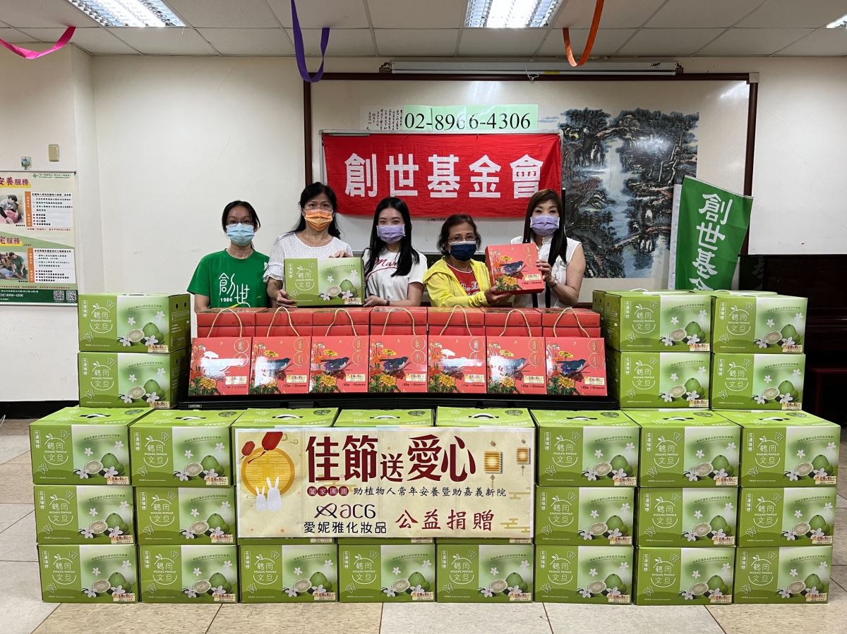 愛妮雅化妝品集團蕭碧月副總裁表示,中秋佳節全家團圓,想起安養院植物人無法與家人團聚,加入創世「佳節送愛心」行動,獲得美容師們踴躍響應超過500盒暖心月餅禮盒,溫暖家屬的心,同時支持植物人常年安養服務。