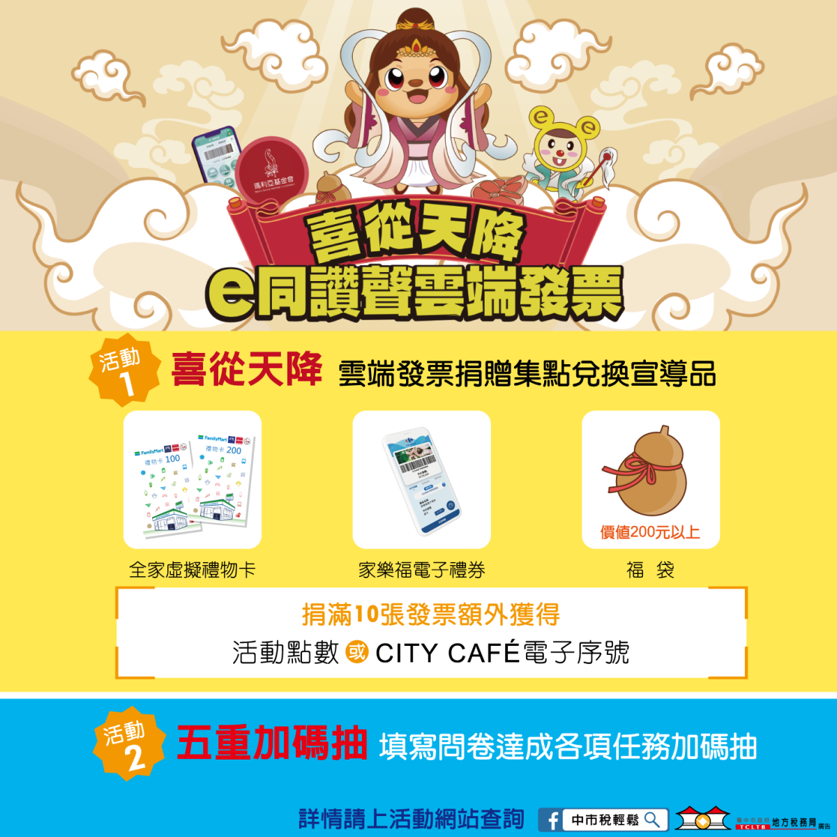台中市政府地方稅務局與瑪利亞社會福利基金會、財政部中區國稅局台中分局舉辦「喜從天降~e同讚聲雲端發票」網路租稅宣導活動,即日起至9月23日,民眾捐發票集點即可兌換全家虛擬禮物卡或家樂福電子禮券,填寫滿意度問卷且獲得點數120點以上,還有機會抽家樂福電子禮券2萬元,歡迎踴躍參加。
